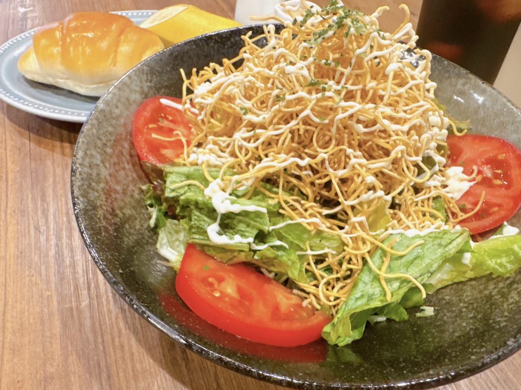 グリーンサラダにフレッシュトマトとパリパリの皿うどん麺をたっぷりのせた食べ応え抜群のサラダプレートです。